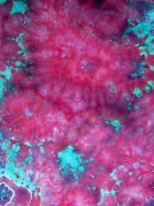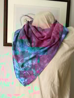 This is a 100% cotton bandana, dyed with colorfast fiber reactive dyes. I use the (very slow) Ice Dye method on my tie dye, which creates a lot of interesting blending and "splitting" (some dyes are made up of more than one color, which will separate as the ice melts and the dye reacts with the fabric). This is a larger bandana, measuring approximately 26x26 inches (there is a slight variation of maybe 1/4 inch).