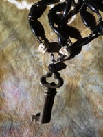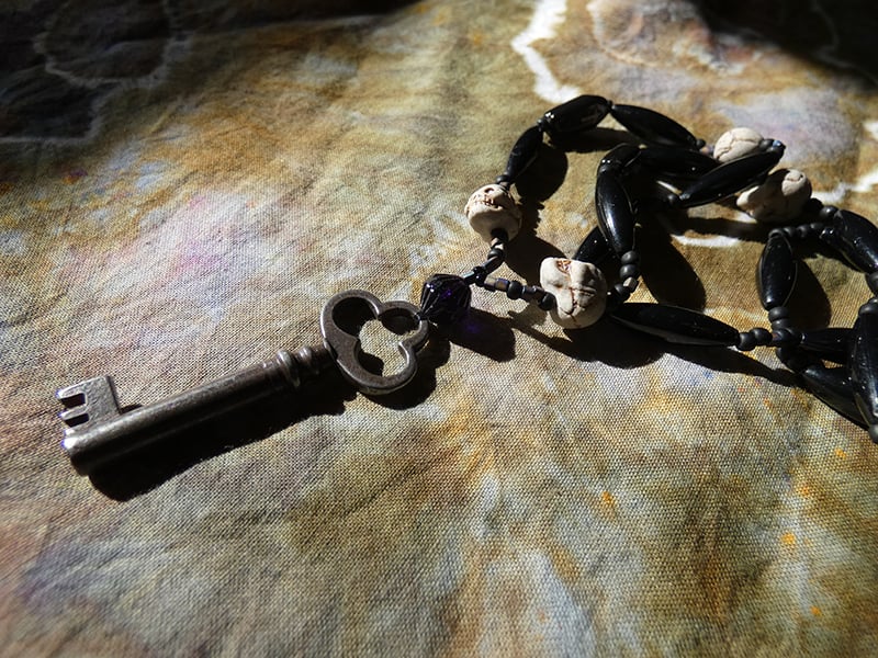 This is a beaded necklace featuring an antique key as the centerpiece. There are cute little skull beads, and a couple of coffin beads, as well. This necklace has been strung on a double strand of thin but strong beading thread. The key is 2 inches long, and the necklace measures a little over 26 inches around, fitting easily over your head.