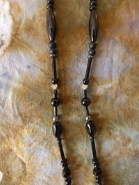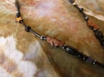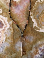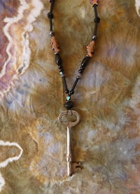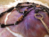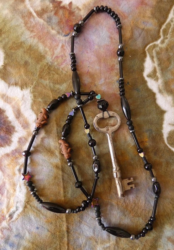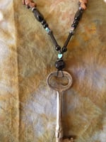 This is a beaded necklace featuring an antique key as the centerpiece. There two little platypus beads, and some stars and hearts as well. This necklace has been strung on a double strand of thin but strong beading thread. The key is 2 1/2 nches long, and the necklace measures a little over 26 inches around, fitting easily over your head.