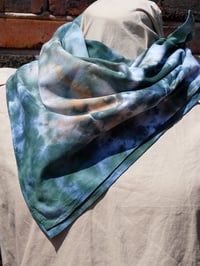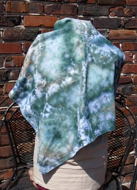 This is a 100% cotton bandana, dyed with colorfast fiber reactive dyes. I use the (very slow) Ice Dye method on my tie dye, which creates a lot of interesting blending and "splitting" (some dyes are made up of more than one color, which will separate as the ice melts and the dye reacts with the fabric). This is a larger bandana, measuring approximately 25.5x25.5 inches (there is a slight variation of maybe 1/4 inch).
