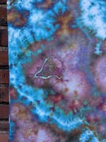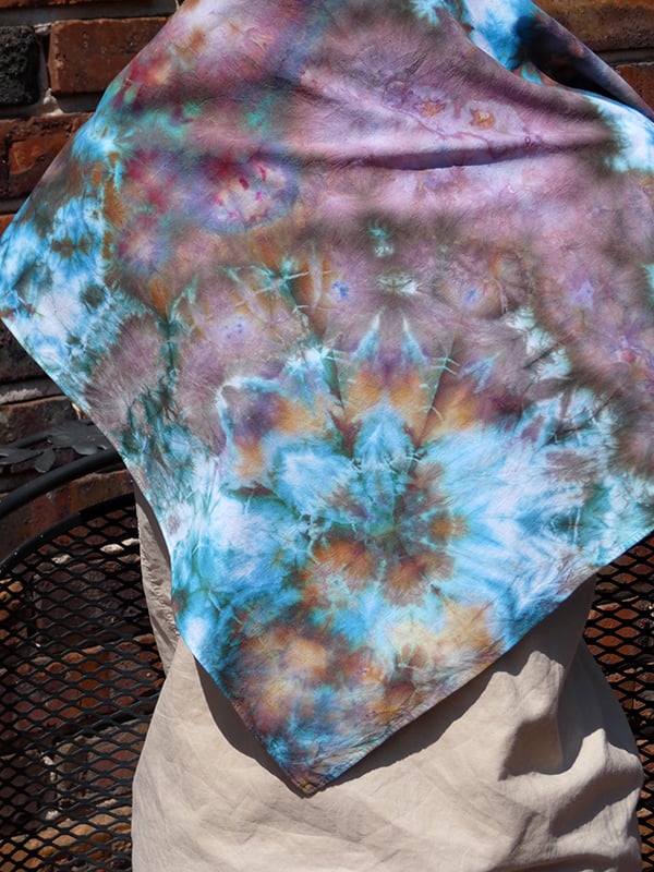 This is a 100% cotton bandana, dyed with colorfast fiber reactive dyes. I use the (very slow) Ice Dye method on my tie dye, which creates a lot of interesting blending and "splitting" (some dyes are made up of more than one color, which will separate as the ice melts and the dye reacts with the fabric). This is a larger bandana, measuring approximately 25.5 x 25.5 inches (there is a slight variation of maybe 1/4 inch).