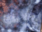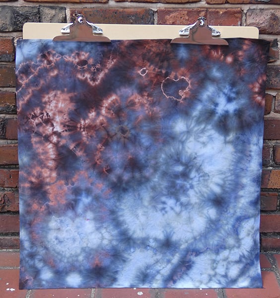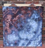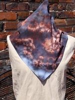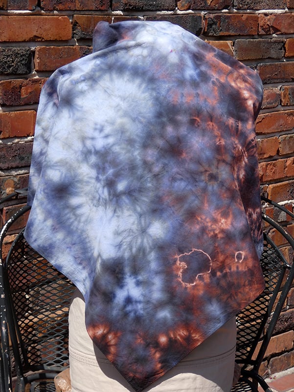 This is a 100% cotton bandana, dyed with colorfast fiber reactive dyes. I use the (very slow) Ice Dye method on my tie dye, which creates a lot of interesting blending and "splitting" (some dyes are made up of more than one color, which will separate as the ice melts and the dye reacts with the fabric). This is a larger bandana, measuring approximately 25.5 x 25.5 inches (there is a slight variation of maybe 1/4 inch).