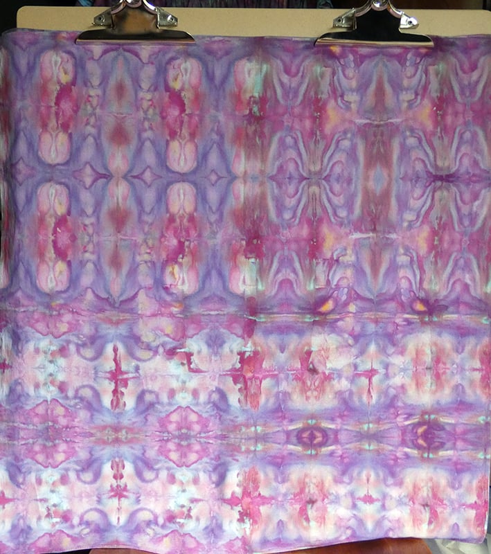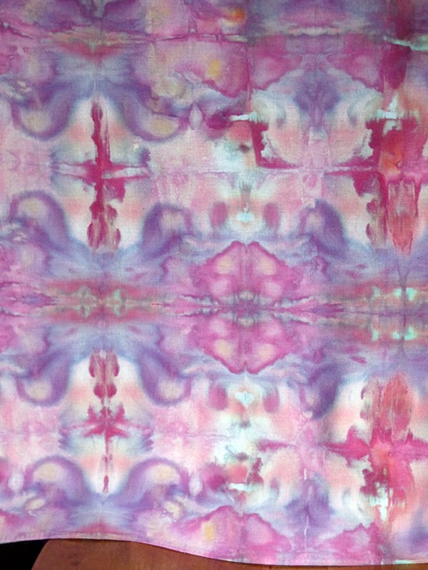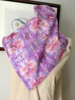 This is a 100% cotton bandana, dyed with colorfast fiber reactive dyes. I use the (very slow) Ice Dye method on my tie dye, which creates a lot of interesting blending and "splitting" (some dyes are made up of more than one color, which will separate as the ice melts and the dye reacts with the fabric). This is a larger bandana, measuring approximately 26x26 inches (there is a slight variation of maybe 1/4 inch).