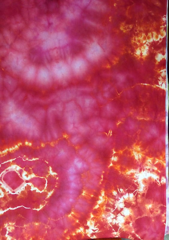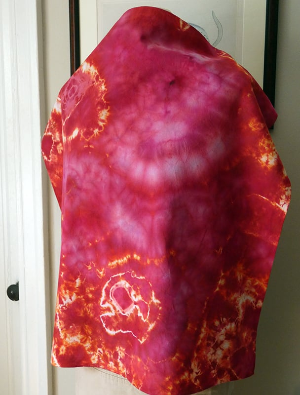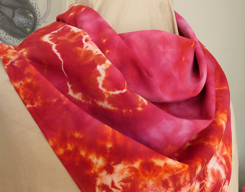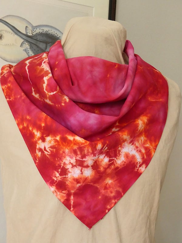 This is a 100% cotton bandana, dyed with colorfast fiber reactive dyes. I use the (very slow) Ice Dye method on my tie dye, which creates a lot of interesting blending and "splitting" (some dyes are made up of more than one color, which will separate as the ice melts and the dye reacts with the fabric). This is a larger bandana, measuring approximately 26x26 inches (there is a slight variation of maybe 1/4 inch).