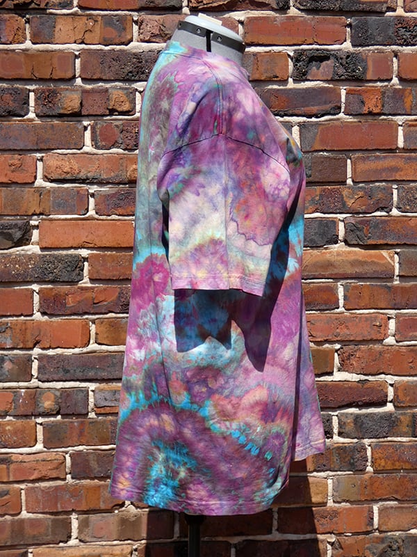 This t-shirts is Dancing Robin brand, which come from a tie dye supplier in Colorado who has them specially made. I like these, because the thread is also cotton and takes dye, so there are no white stitching threads showing. These shirts are a really nice weight - heavy enough to take the dye well, but soft. They are not flimsy like some modern t-shirts that feel like they may not last through the years.